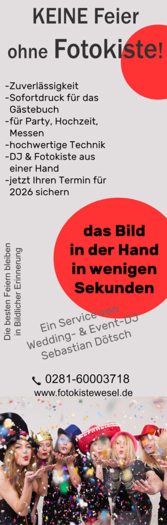 Lasst euch überraschen. Natürlich findet ihr den Flyer auch hier auf meiner Webseite. Sichern Sie sich jetzt die Fotokiste für Ihren Hochzeitstermin. Neue Props, Hüte und Brillen sind auch eingetroffen. Der Start ende 2017 der Fotokistewesel war ein voller Erfolg und hat auf einigen Feiern für richtig gute Stimmung gesorgt. Es sind viele tolle Bilder entstanden und die Gastgeber haben die Miete nicht bereut. Alle Prints wurden in der passwortgeschützten Onlinegalerie hochgeladen und waren stets einen Tag später erreichbar. Zusätzlich gab es die Originalbilder auch auf einen USB Stick.